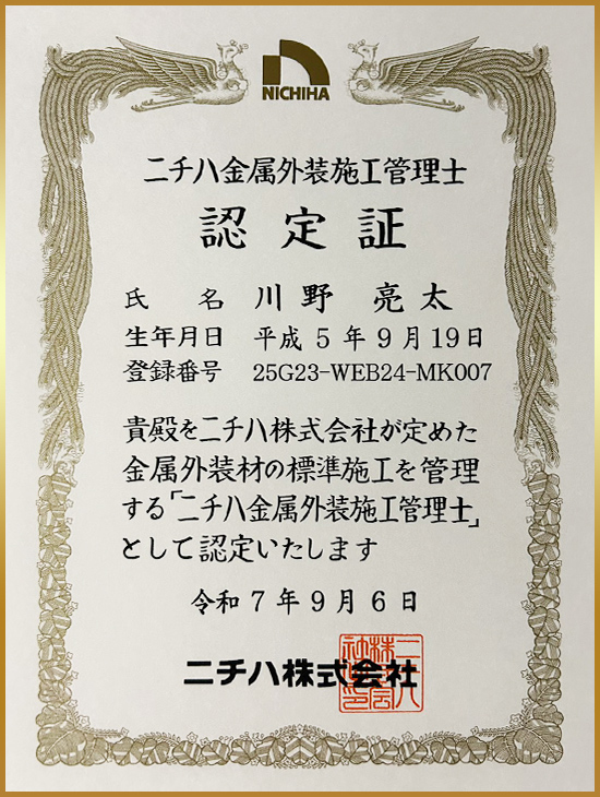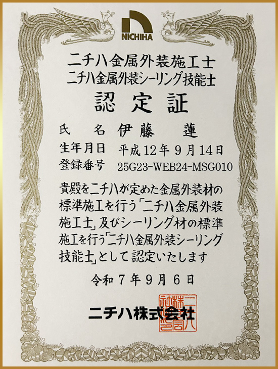 | 所有資格 | 足場の組立て等作業主任者 フルハーネス特別教育 足場の組立て等特別教育 丸のこ等取り扱い作業従事者教育 研削といしの取替え等の業務に係る特別教育 |